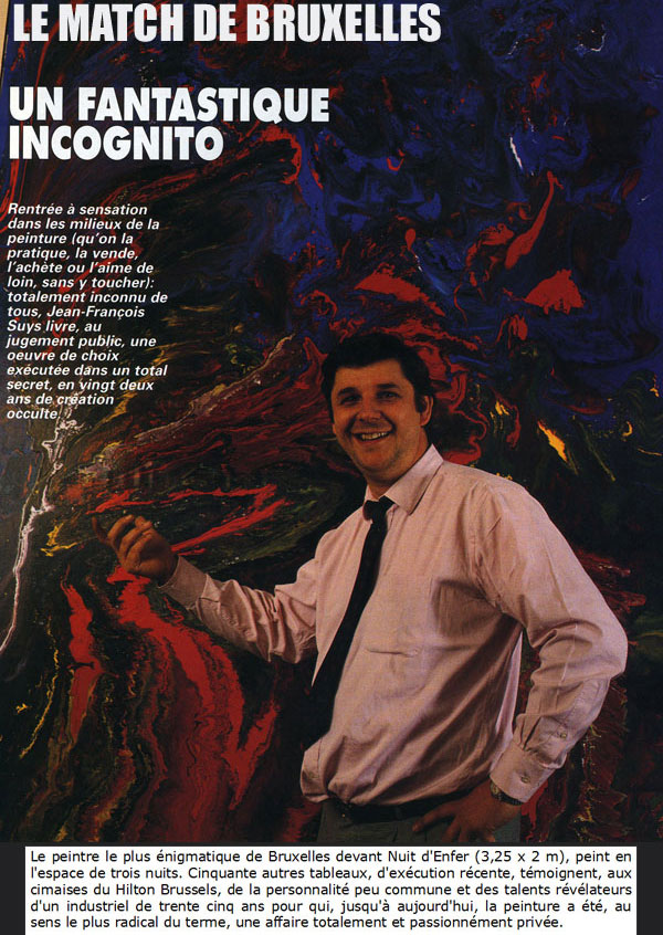 L’automne a bien commencé. Le gibier à plumes et à poils a été exact au rendez-vous du fruit de mer à coquille. En retard d’une saison l’été s’est laissé conter fleurette par ce beau ténébreux de septembre. Et voici qu’on a, pour célébrer la rentrée, la révélation d’un peintre abstrait de talent jusqu’alors totalement inconnu de la critique, du public, des marchands et des autres peintres. Pourtant, l’incroyable s’explique : depuis vingt-deux ans qu’il se livre corps et âme, à son art, Jean-François Suys serres ses toiles, sitôt sèches, en un lien aussi inviolable que le mystérieux cabinet de Barbe-Bleue. Ce qui n’arrange rien : il snobe les expositions de ses homologues, même illustres, aussi spontanément qu’il se tient à l’écart de tout ce qui concerne et compose la vie artistique. En fait, il ne se reconnait qu’un guide : son père trop tôt disparu.